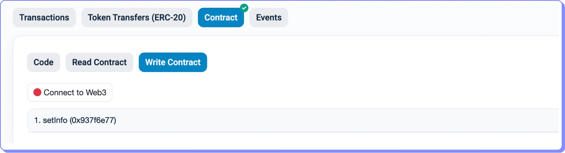 Vemos que setInfo é a única função de escrita. Para utilizá-la, primeiro precisamos conectar nossa wallet ao Etherscan. Para isso, clique em Connect to Web3.