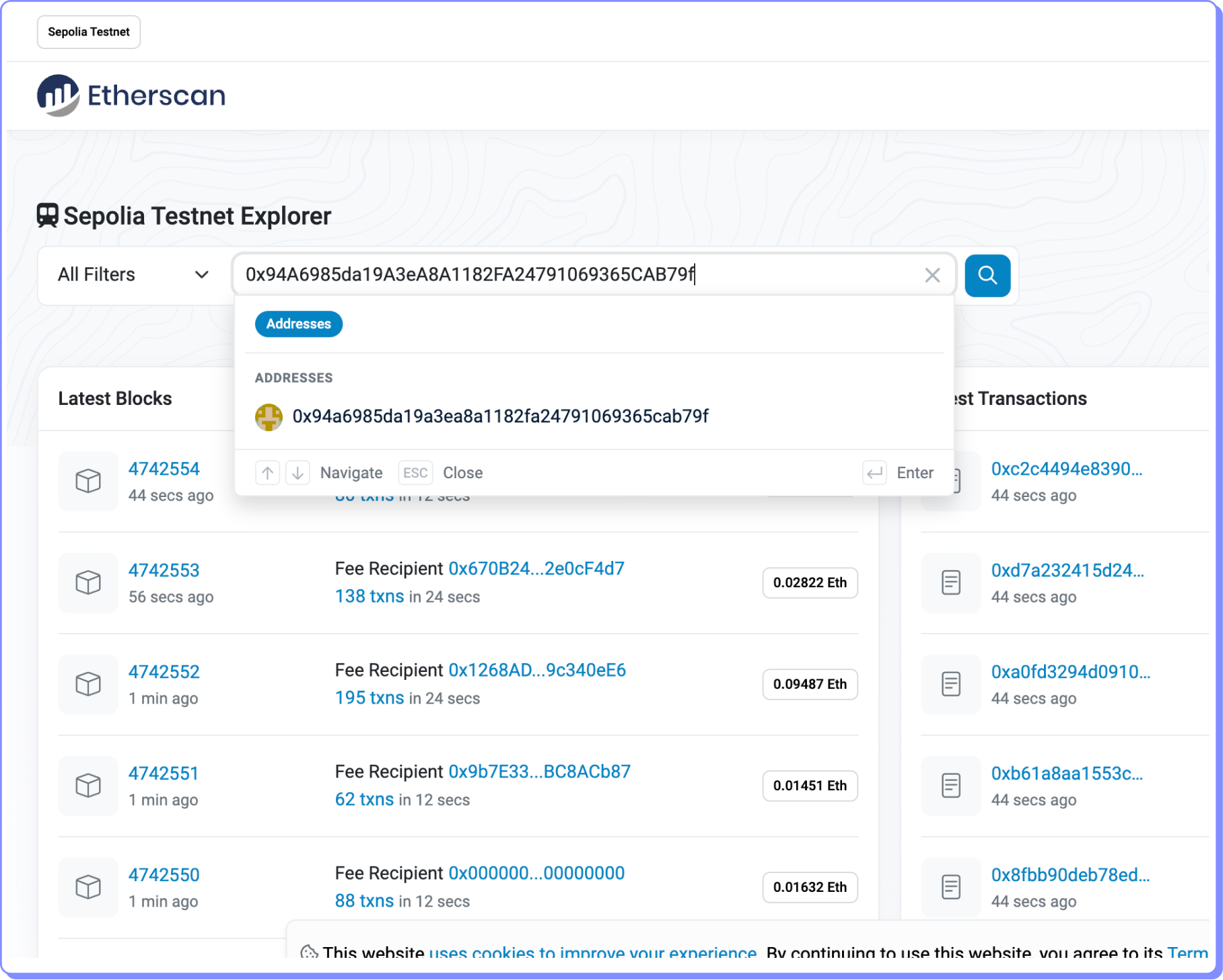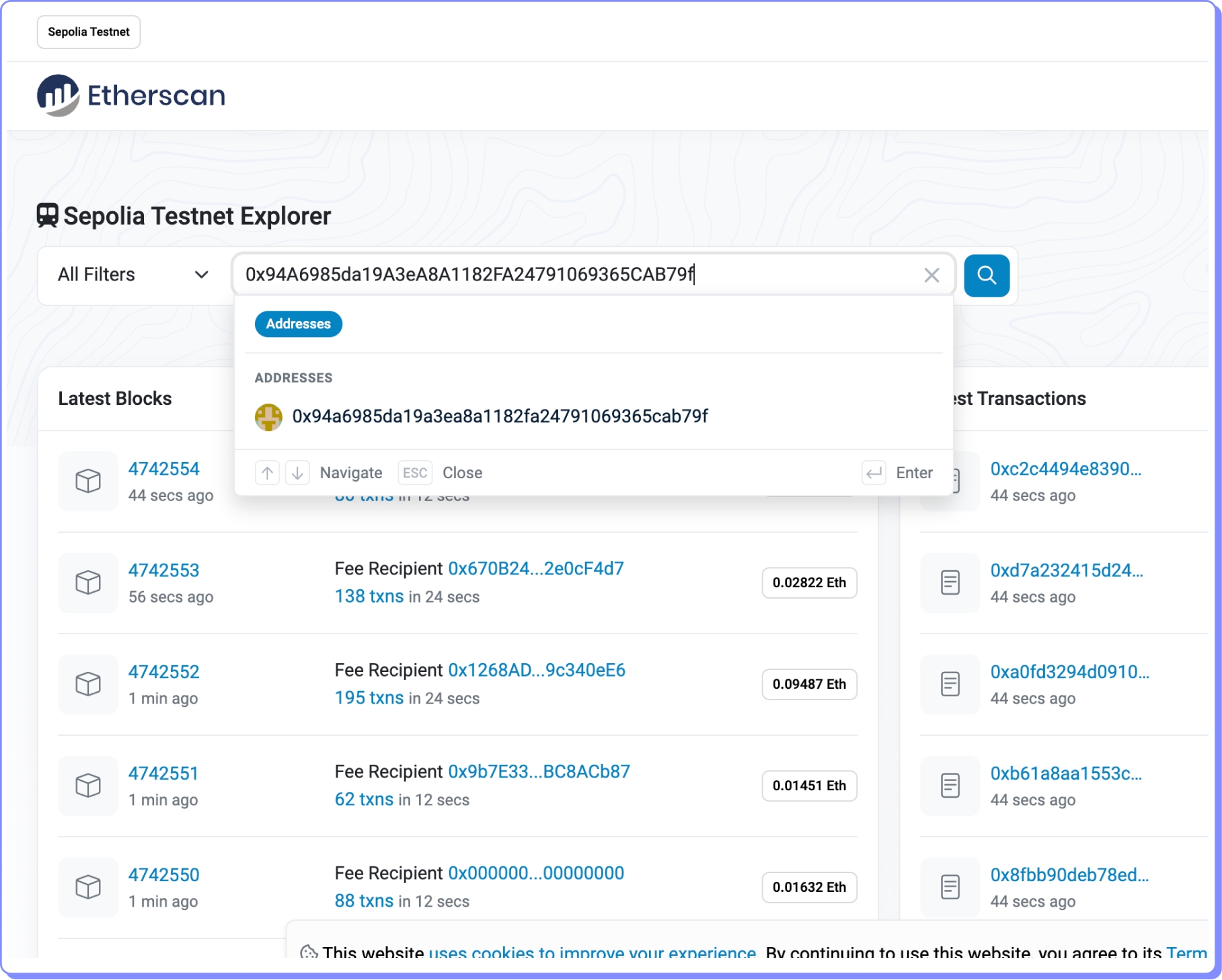 Insira a conta no campo de busca do explorador de Sepolia.