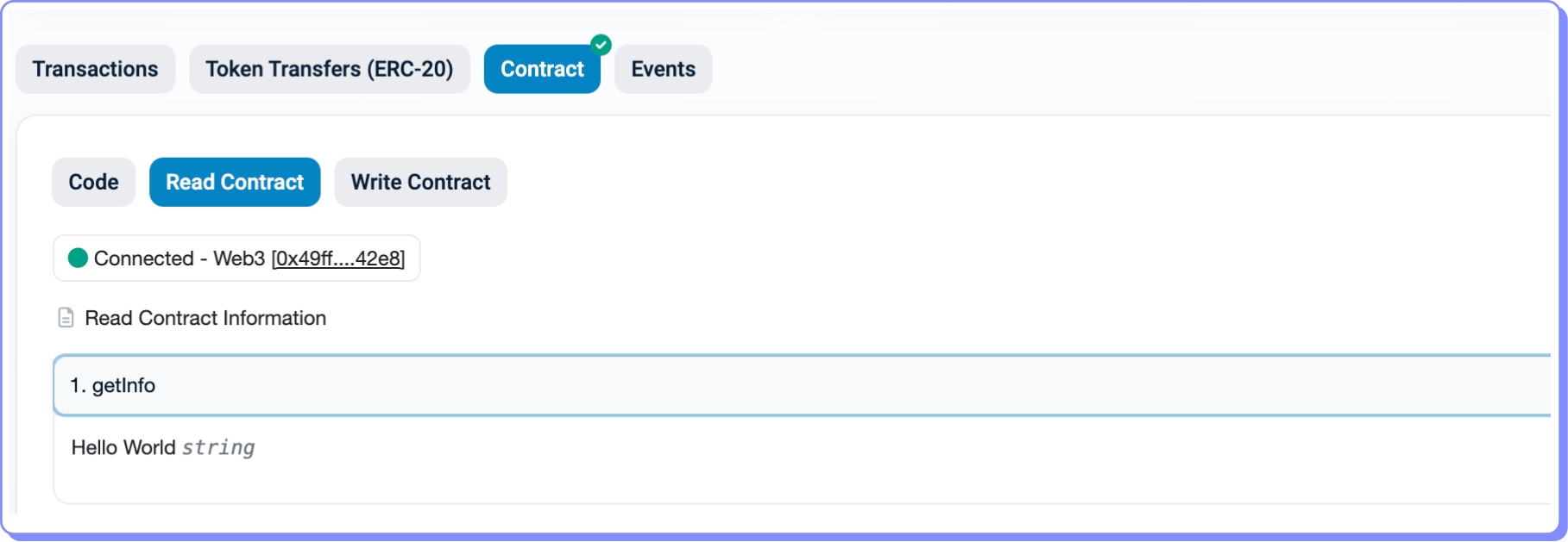Para verificar se a transação foi bem-sucedida, podemos acessar Read Contract e visualizar o conteúdo da variável storedInfo utilizando a função de leitura getInfo.