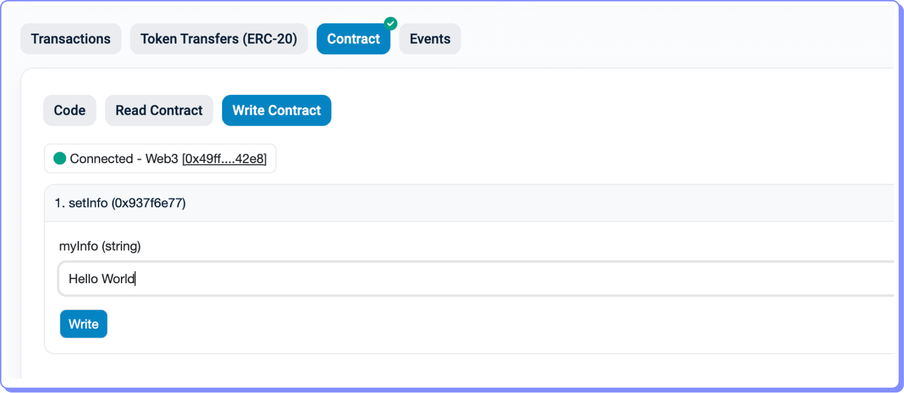 Podemos, então, interagir com nosso contrato inteligente diretamente do explorador de blocos.