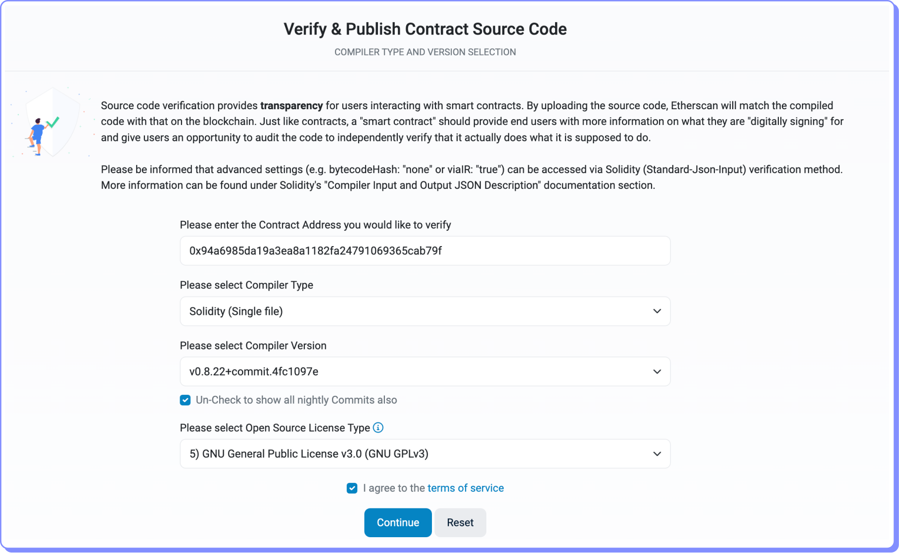 Será exibida a tela seguinte, onde devemos preencher a endereço do contrato, o tipo de compilador utilizado, a versão do compilador e o tipo de licença Open Source. Em seguida, clicamos em Continuar.
