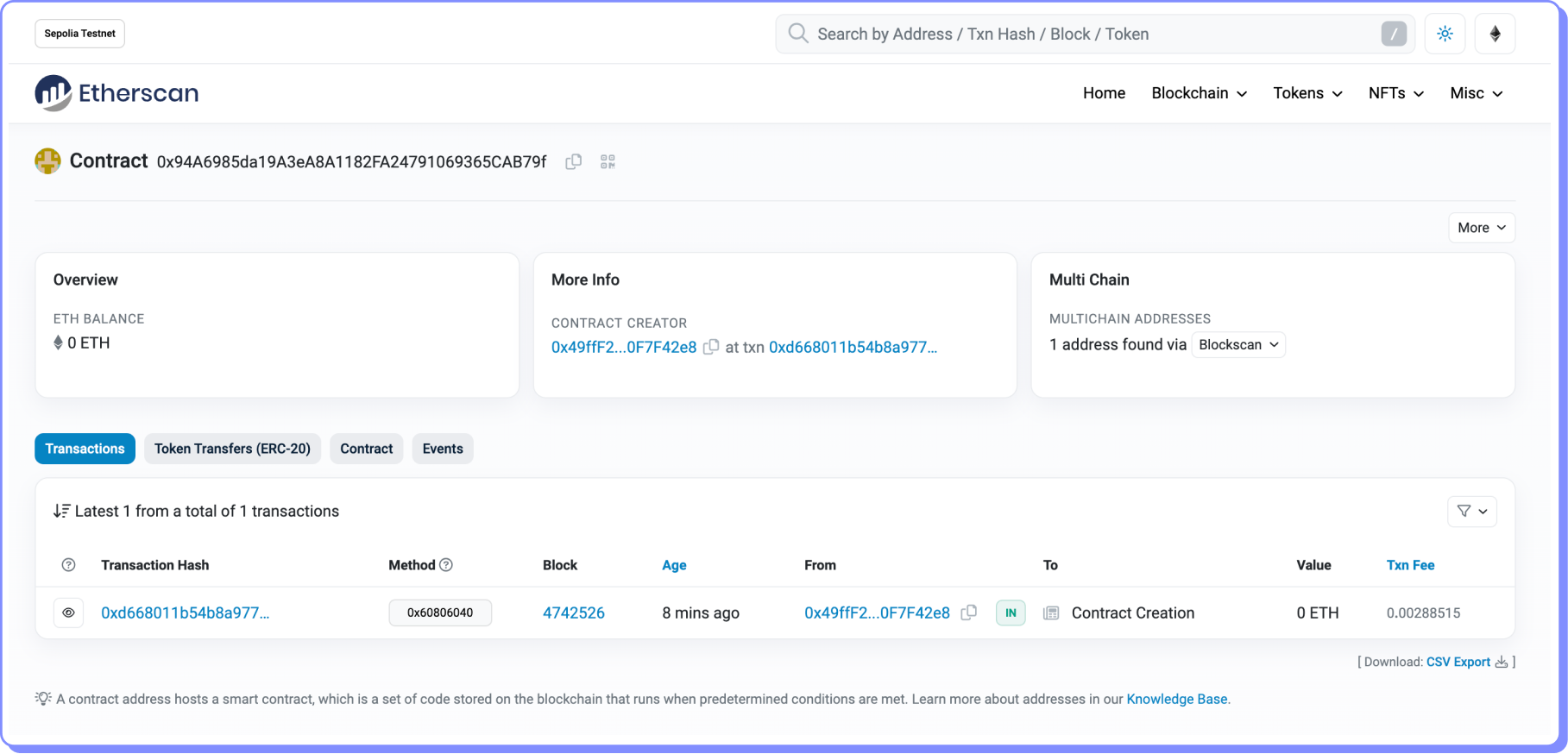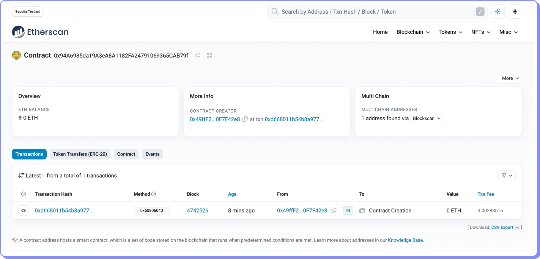 Podemos confirmar que uma conta de contrato foi criada a partir da nossa EOA em Sepolia.