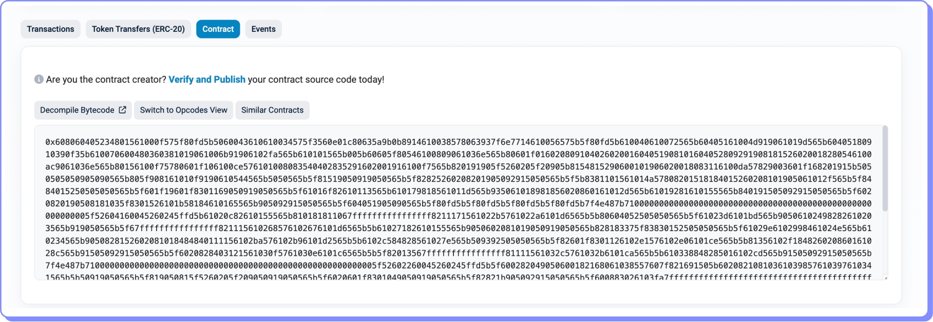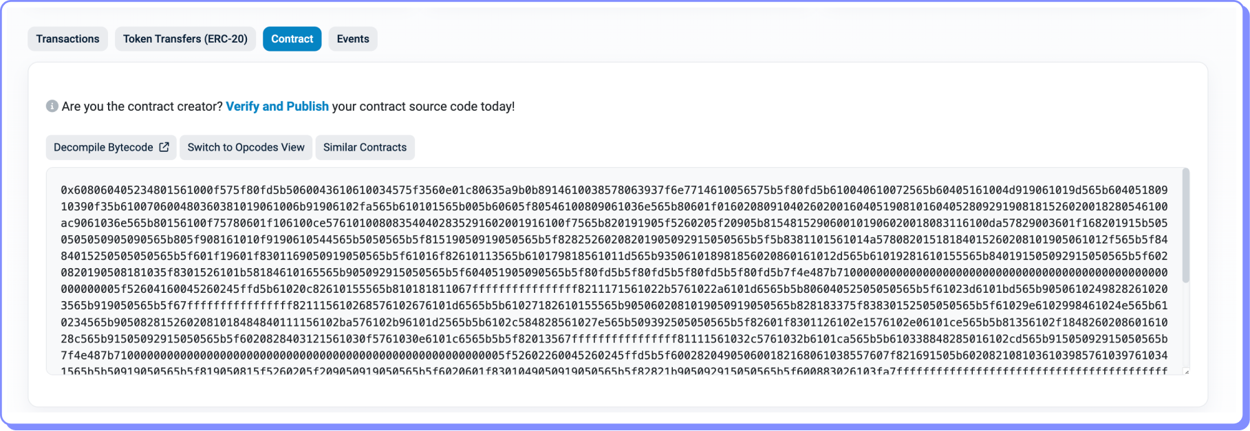 Se acessarmos a aba Contract, podemos visualizar o bytecode que foi implantado nessa conta de contrato.