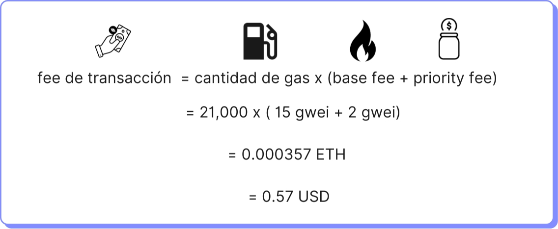 Suponhamos que queremos executar uma transação de 21.000 gas, como uma transferência de ETH. Se a base fee for 15 gwei e estamos dispostos a pagar uma priority fee de 2 gwei.