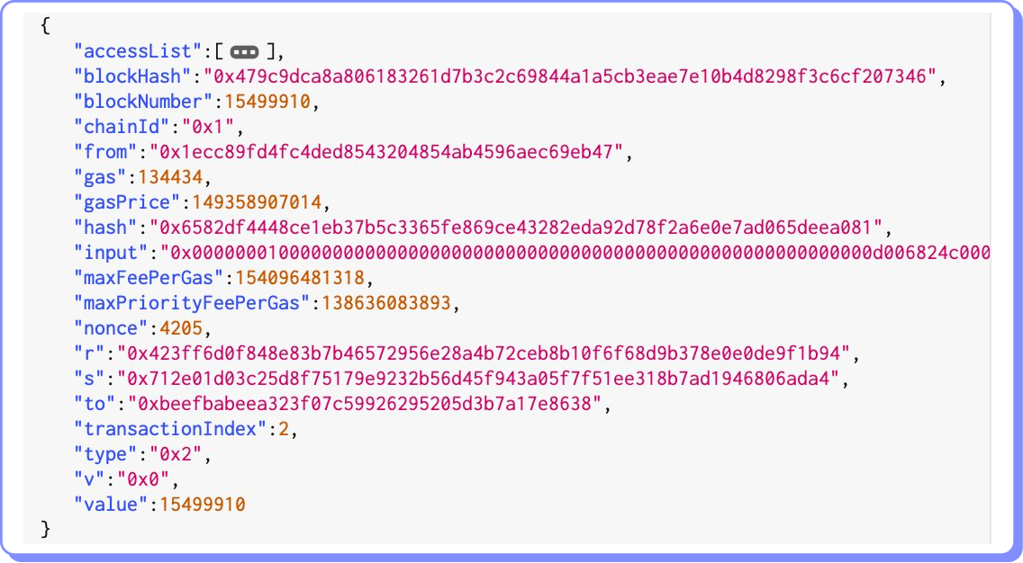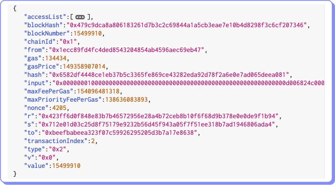 accessList: uma lista de endereços e chaves de armazenamento que a transação pretende acessar. O access list foi introduzido pela proposta de melhoria EIP-2930, que tem como objetivo melhorar a escalabilidade e reduzir os custos de gás para transações que acessam armazenamento externo. O custo de gás para acessar esses endereços recebe um desconto.