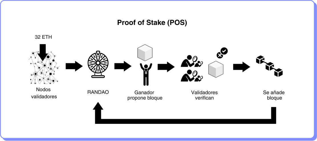 Este modelo de consenso baseia-se no "stake", ou seja, o valor de criptomoedas que os participantes colocam à disposição da rede, em vez de depender da potência de processamento. Os nós que possuem mais criptomoedas têm maior probabilidade de serem escolhidos para validar as transações. Este modelo é mais eficiente em termos de energia do que o PoW.
