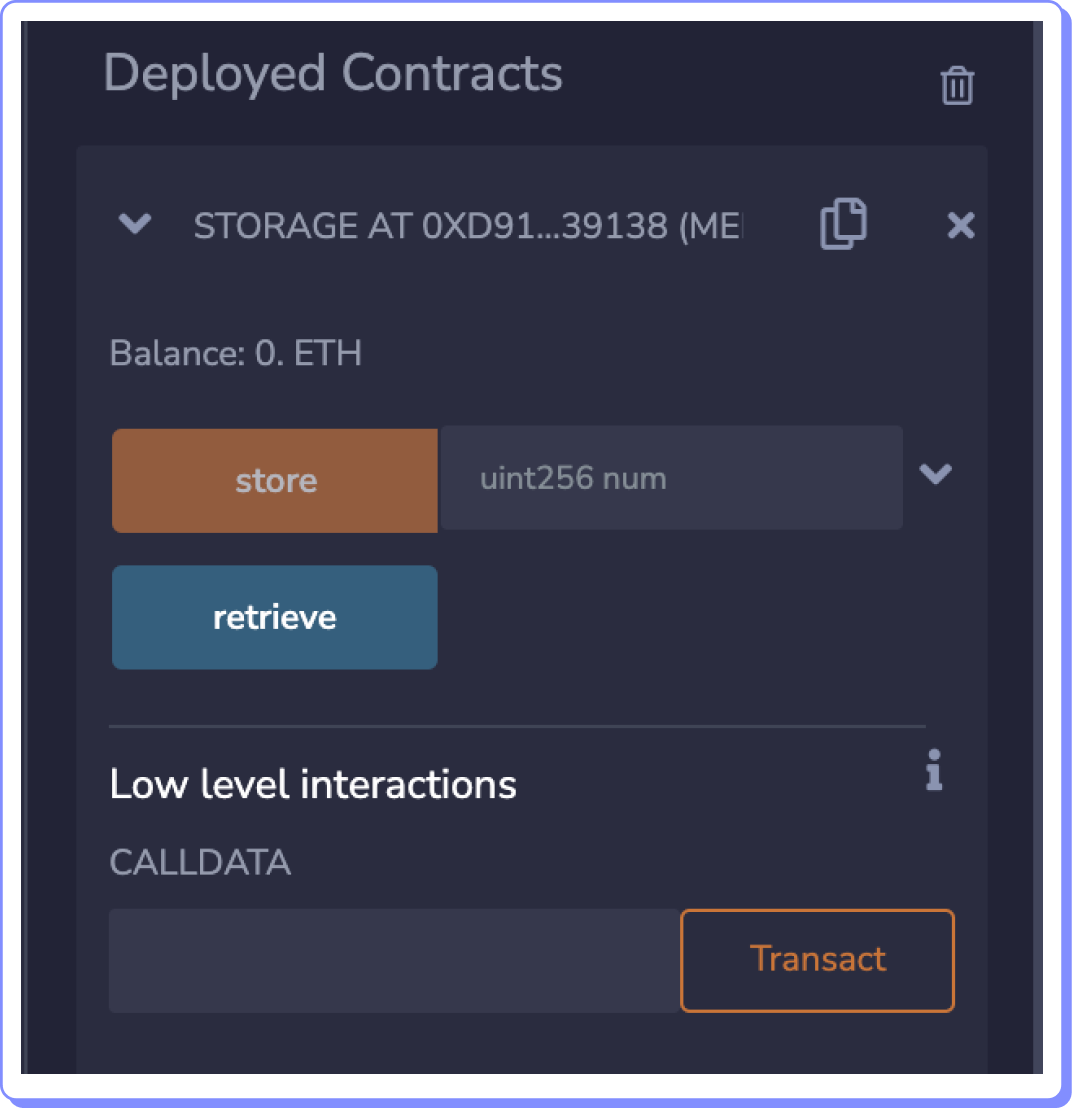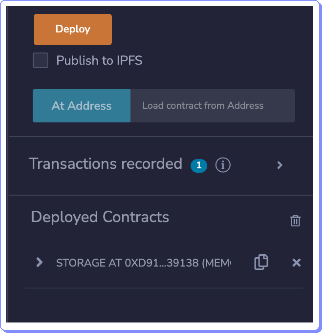 Agora acessaremos as funções de um contrato implantado. Você pode observar que, após o contrato ter sido implantado, ele aparece na parte inferior do painel lateral, na seção Deployed Contracts.