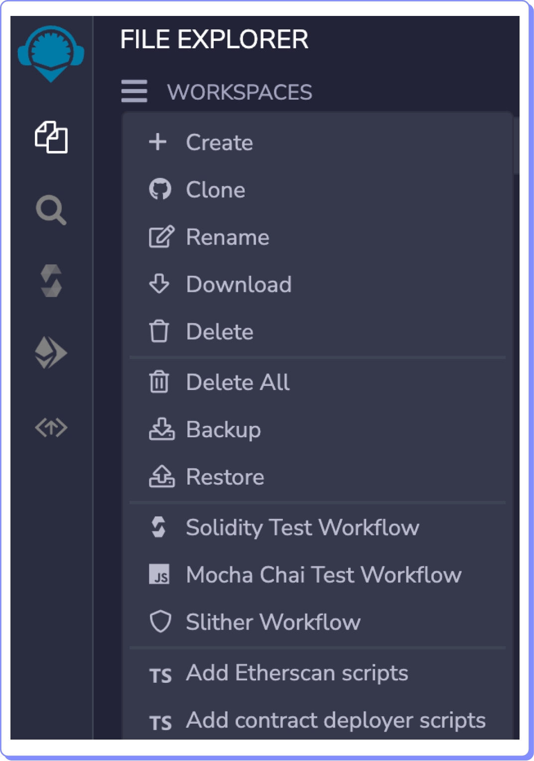 Para criar um espaço de trabalho, clique no explorador de arquivos do painel de ícones, em seguida, selecione o menu hambúrguer e escolha a opção Create.