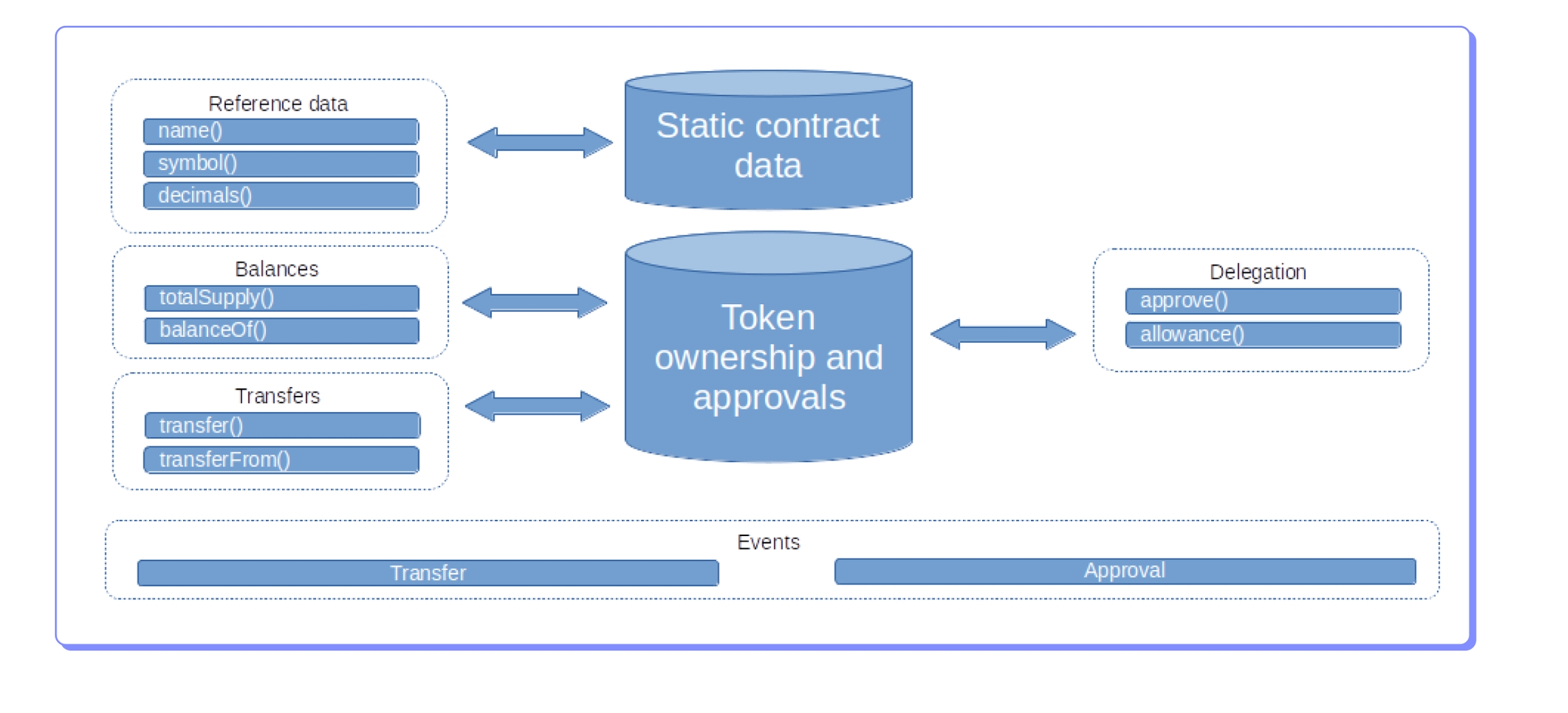 Um contrato inteligente ERC-20 deve implementar as seguintes funções e eventos: