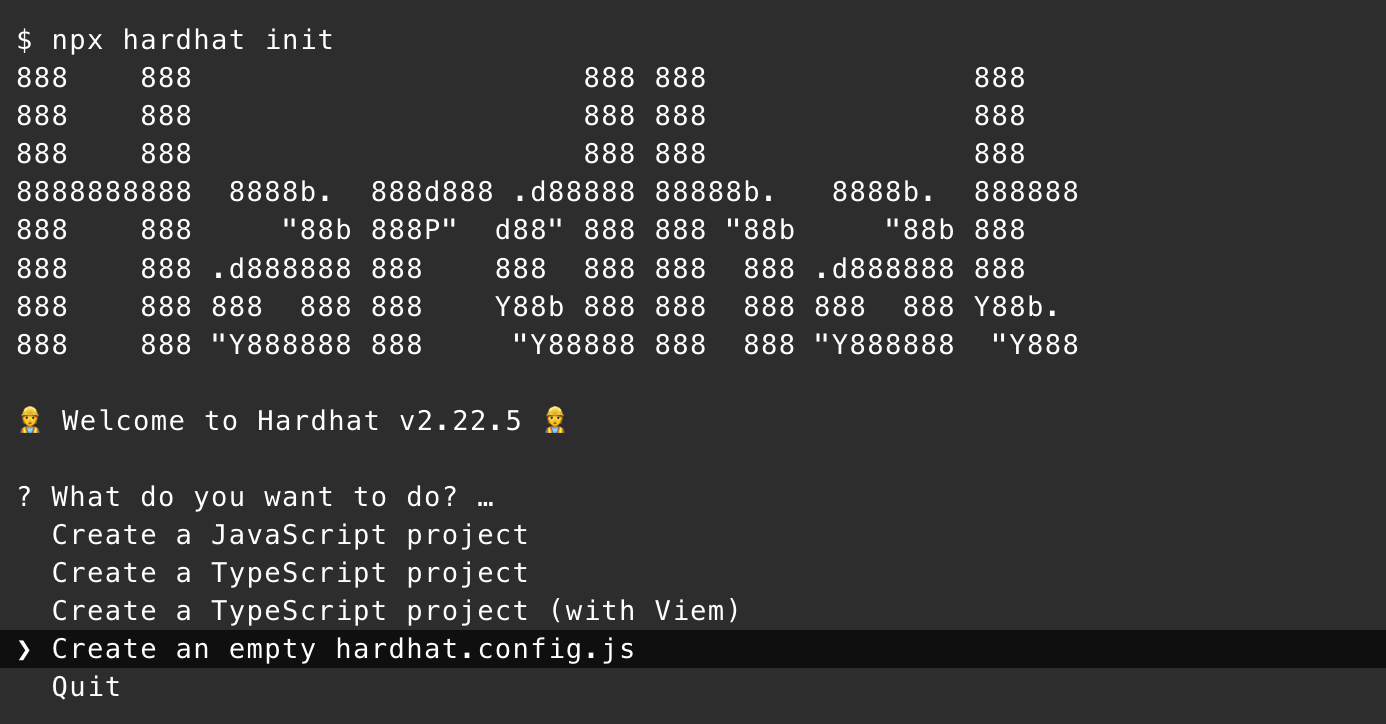 npx hardhat initSiga as instruções para criar um arquivo hardhat.config.js vazio.