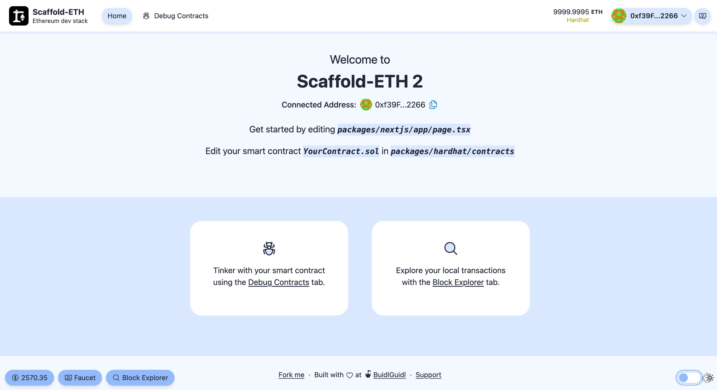 yarn startVocê pode editar o Front-End no arquivo packages/nextjs/app/page.tsx